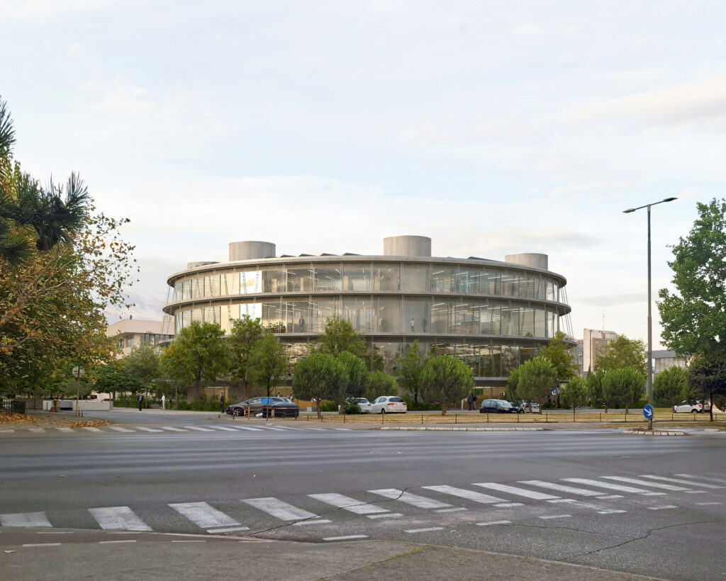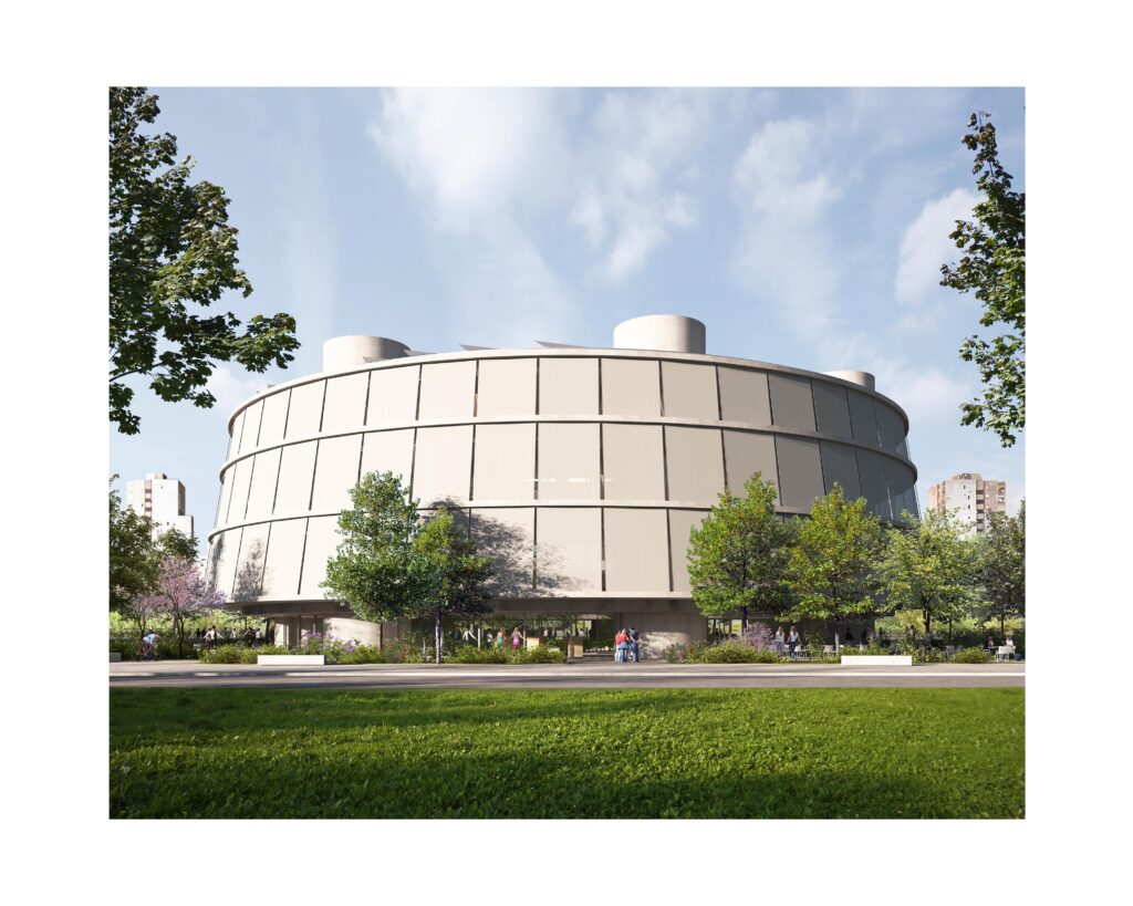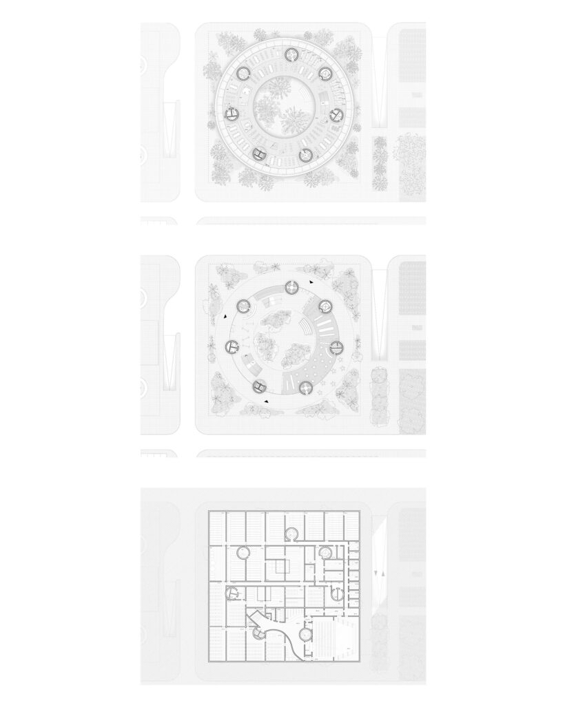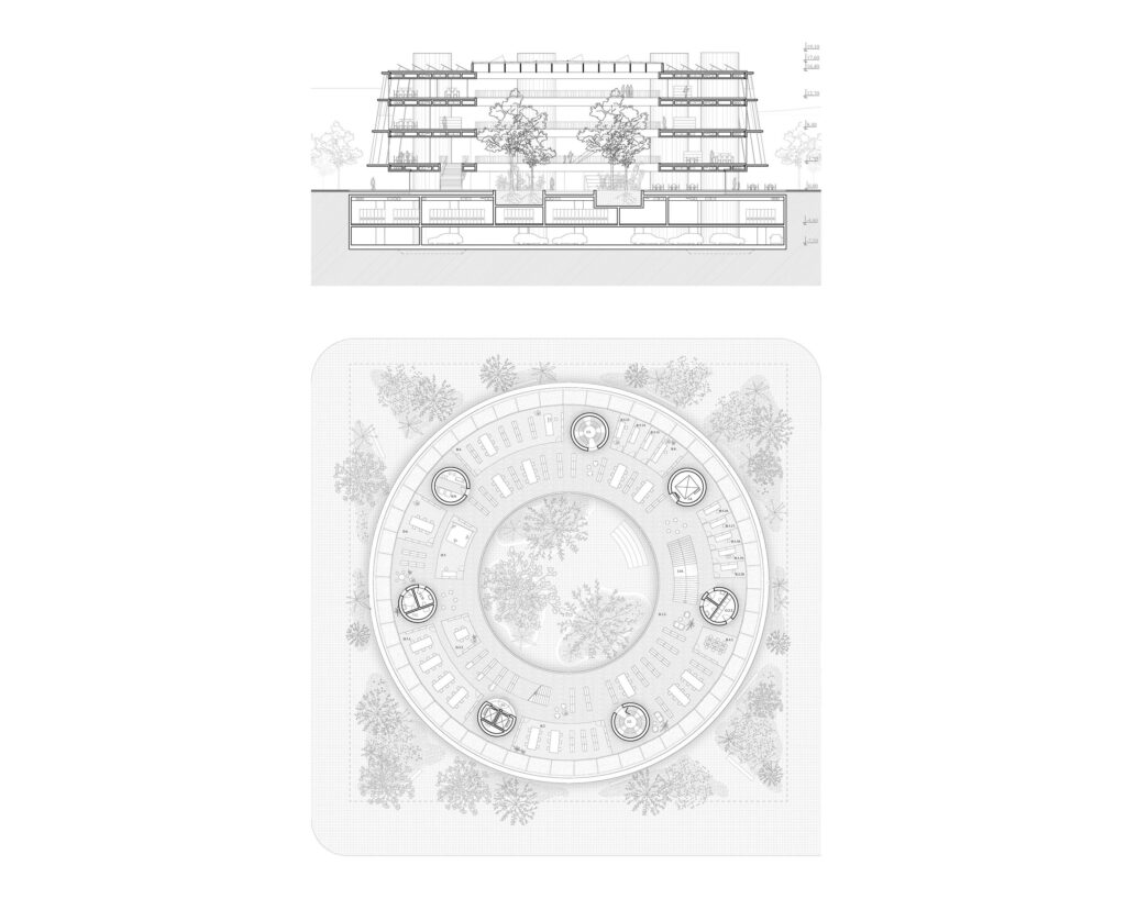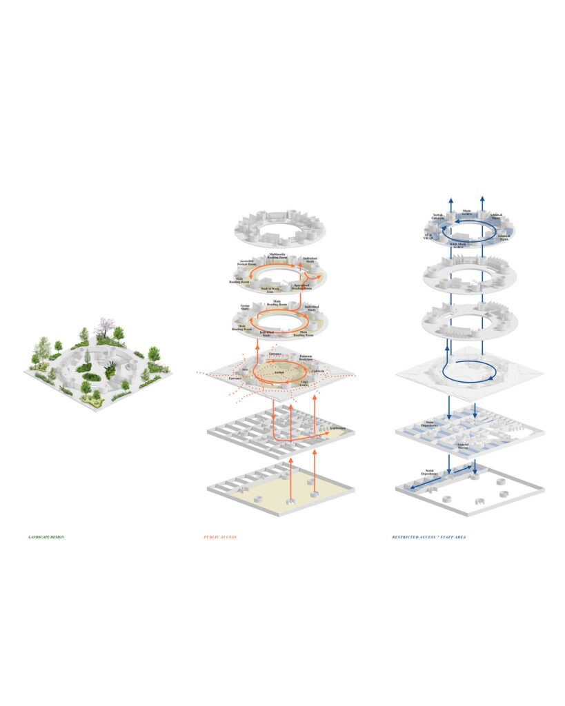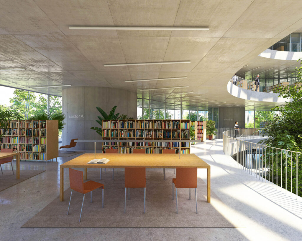 By its very nature, the circular form is equally oriented in all directions. Its balanced relationship to both the city/boulevard and the university campus promotes the theme of campus openness and encourages xchange and encounters. The circular shape also affirms and consolidates the pedestrian network of the entire campus, with all paths intersecting at the library’s center. Through its circular form, the library abolishes the hierarchical organization of the immediate urban context as well as the hierarchical arrangement within the building itself. The radial internal organization is structured around a green atrium, serving as the building’s microclimatic core. This atrium connects all functional programs, enables an integrated system of ventilation and climate control, and simultaneously unites all floors into a coherent whole. At the ground floor, the boundaries between interior and exterior spaces are almost entirely erased, creating a continuous public space—a potential “living room” of the campus. The rudimentary nature of the form is translated into a clear and legible structural system, allowing exceptional flexibility in the spatial organization of individual floors. The structural system consists of seven oval concrete cores, reinforced with columns that house vertical circulation and auxiliary library spaces. All remaining space is open for flexible programmatic allocation. The complex program of the library is interpreted by the authors in the simplest possible manner, as a sequence of programs arranged in a ring-shaped layout, oriented simultaneously toward the campus and the atrium at the building’s center.