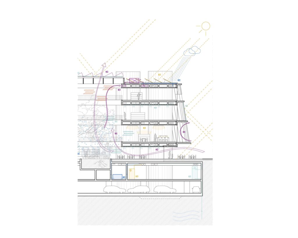Zasnova sledi načelu iskrenega prikaza materialov gradnje. Talne plošče in vertikalna jedra so izdelana iz vidnega betona, vidnega od zunaj in od znotraj. Fasada je zasteklena z okni v polni višini, ki omogočajo, da se konture zelenega okolja razširijo v notranjost.