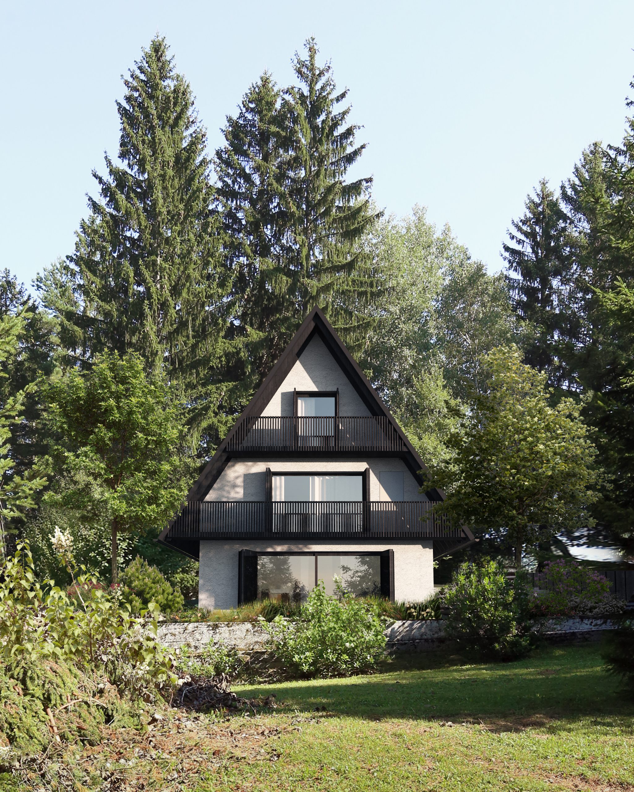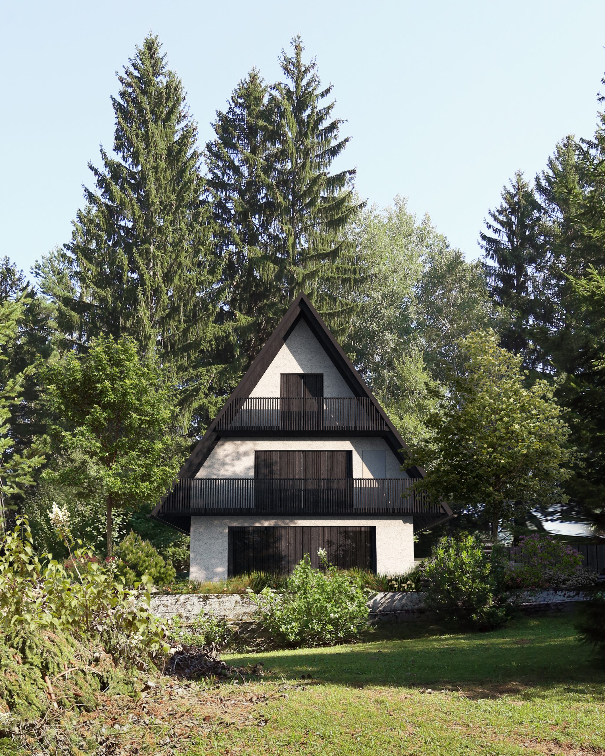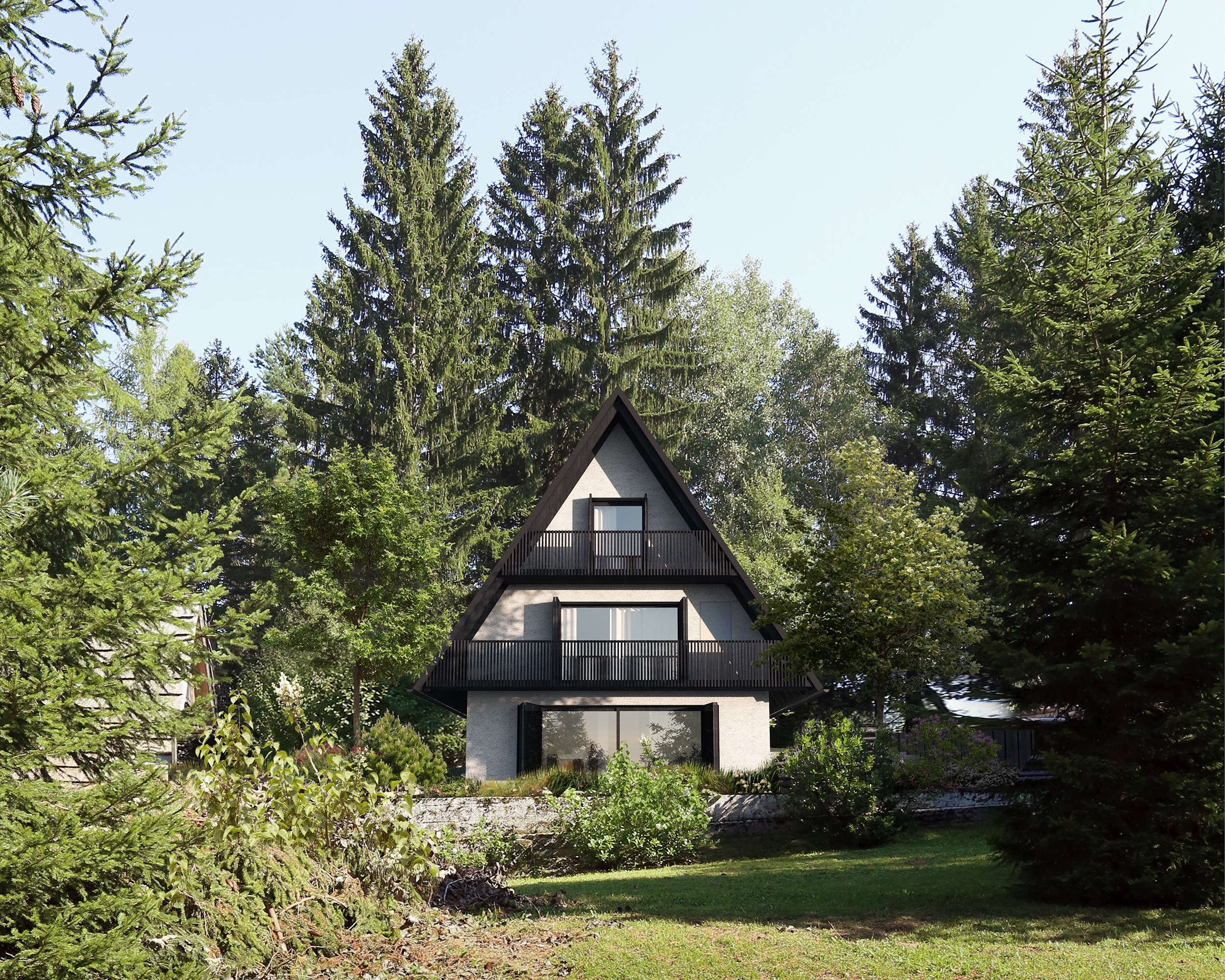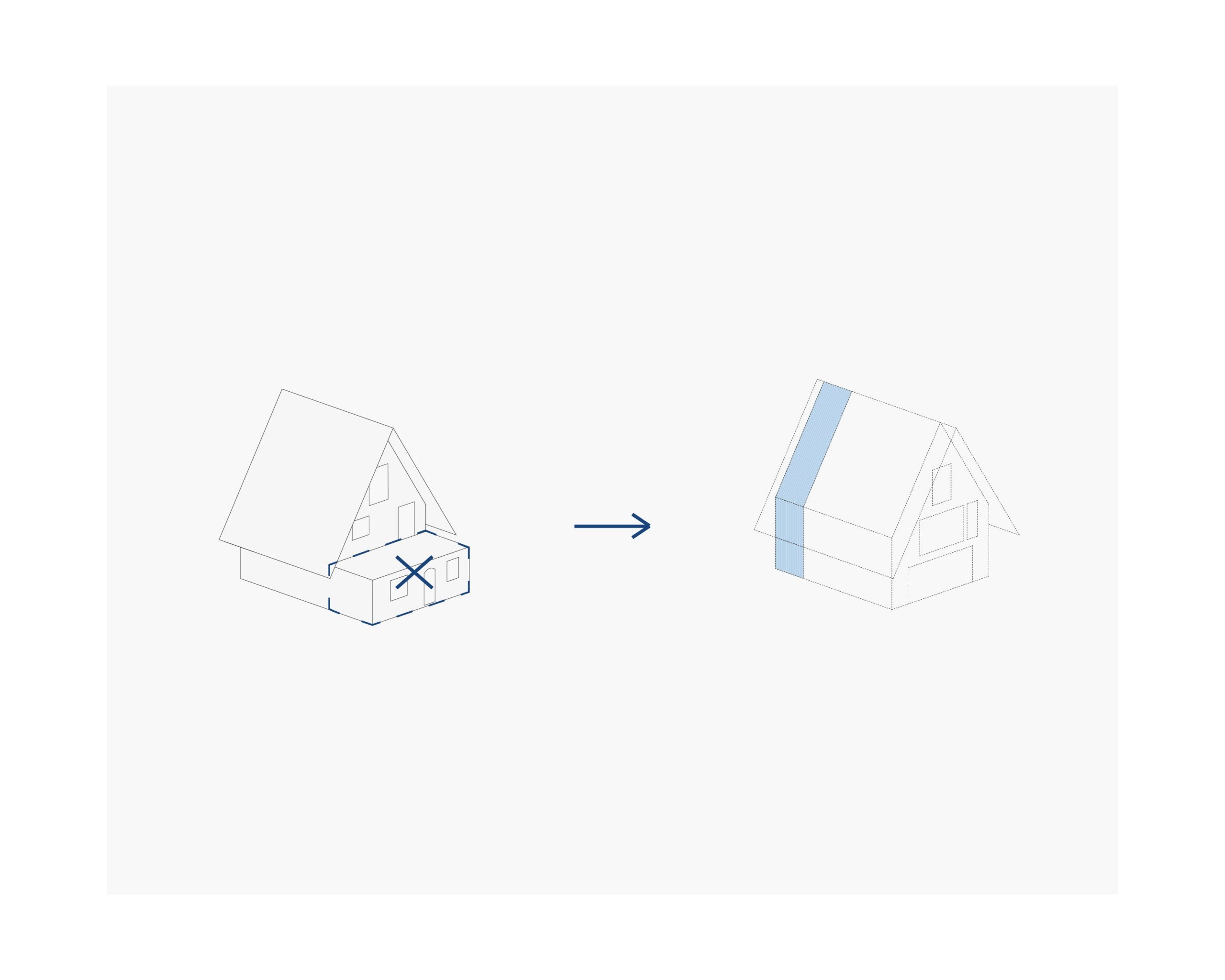 Obstoječa počitniška hiša ima neracionalno zasnovan tloris. Odstranimo prizidek, na zadnji strani objekta pa dodamo nov servisni pas, v katerem so stopnišče, sanitarije in tehnični prostori.