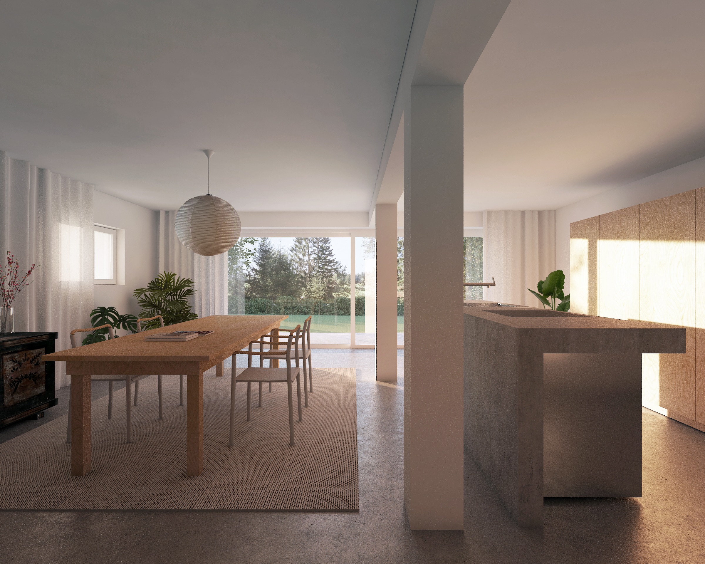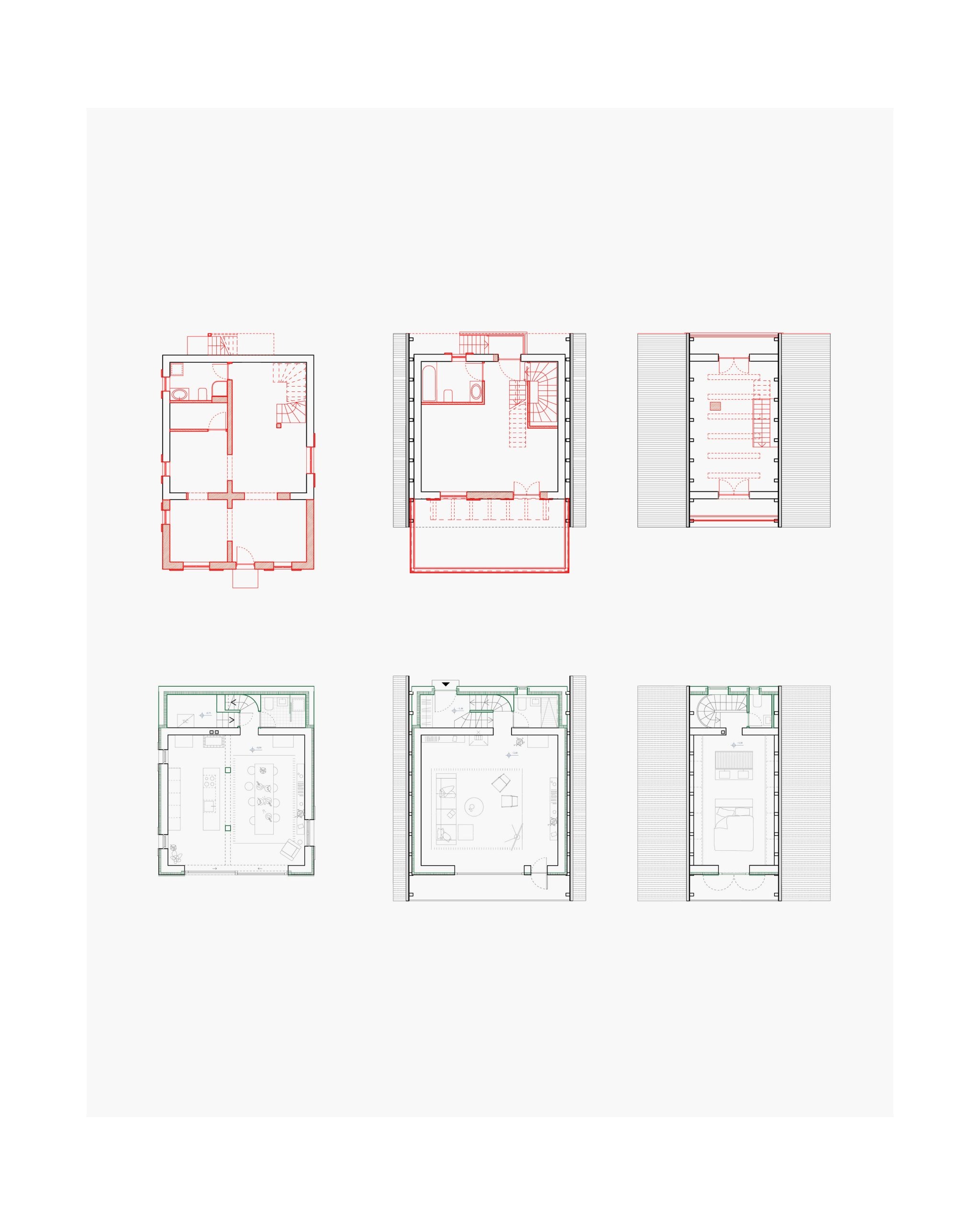 V ohranjeno lupino objekta smo nato vstavili nov program. V pritličju se nahaja kuhinja z jedilnico in izhodom na sončno teraso pred hišo. V nadstropju je dnevna soba z novim oknom in skritim izhodom na balkon, umeščenim v fasado. V mansardi je spalnica, kjer so tuš in umivalniki postavljeni v osrednji del prostora.