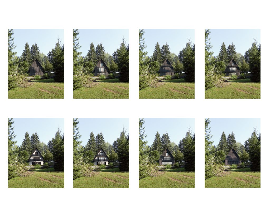 Pri prenovi smo želeli ohraniti značaj in prepoznavno podobo obstoječe hiše. Fasada ostaja ometana, dopolnjena z lesenimi polkni, kar povzema tradicionalni izraz okoliških stavb. Z zadržano oblikovno govorico in ohranjanjem osnovnega volumna hiša ne izstopa iz vaškega okolja, temveč se vanj umirjeno in naravno vključi. Z zunanjo ureditvijo nismo posegali v obstoječe stanje, zgolj malce smo ga obnovili in tlakovali novo potko, do vhoda hiške, ki se nahaja na zadnji severni fasadi.